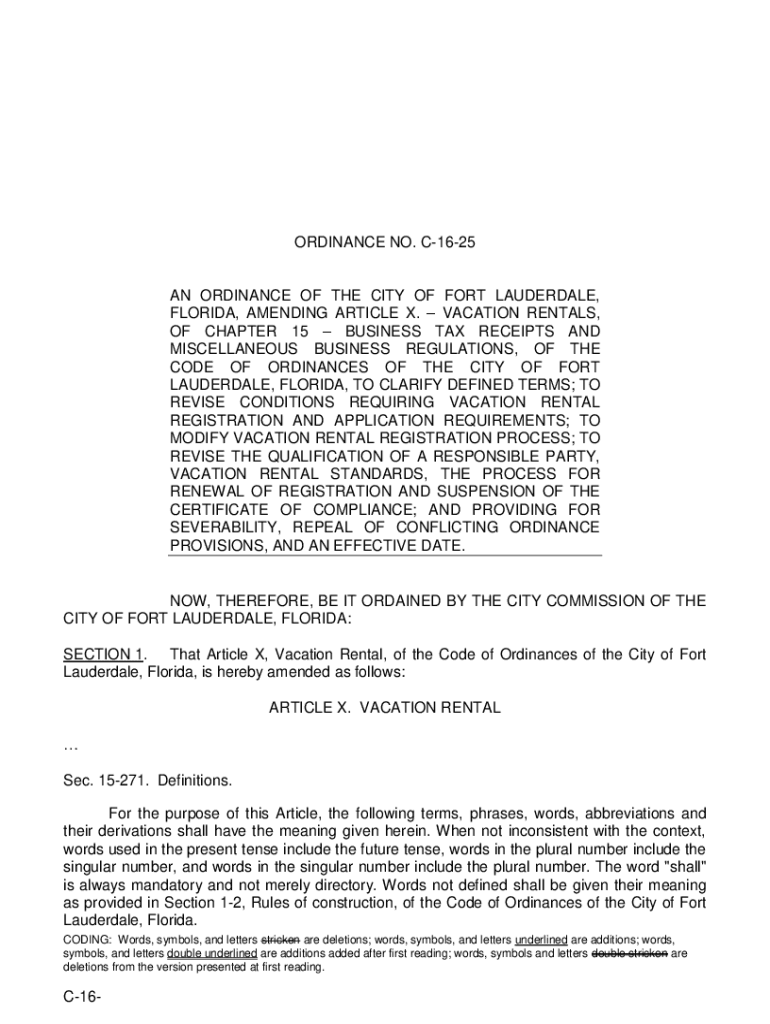ORDINANCE NO. C1625AN ORDINANCE OF THE CITY OF FORT LAUDERDALE, FLORIDA, AMENDING ARTICLE X. VACATION RENTALS, OF CHAPTER 15 BUSINESS TAX RECEIPTS AND MISCELLANEOUS BUSINESS REGULATIONS, OF THE CODE