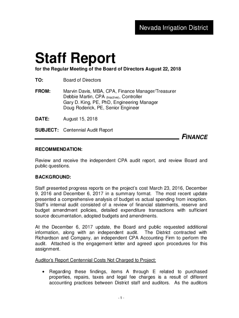 Nevada Irrigation DistrictStaff Report for the Regular Meeting of the Board of Directors August 22, 2018, TO:Board of DirectorsFROM:Marvin Davis, MBA, CPA, Finance Manager/Treasurer Debbie Martin,