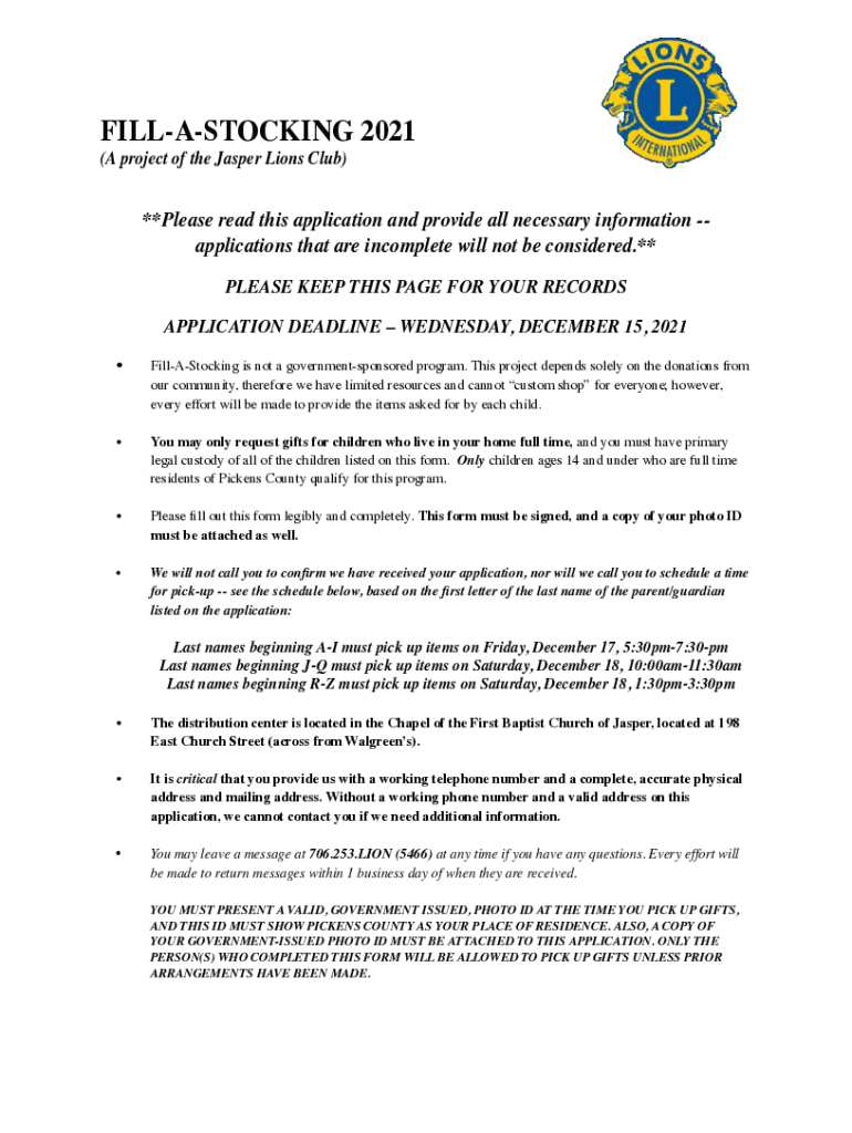 (A project of the Jasper Lions Club)**Please read this application and provide all necessary information applications that are incomplete will not be considered.** PLEASE KEEP THIS PAGE FOR YOUR RECORDS