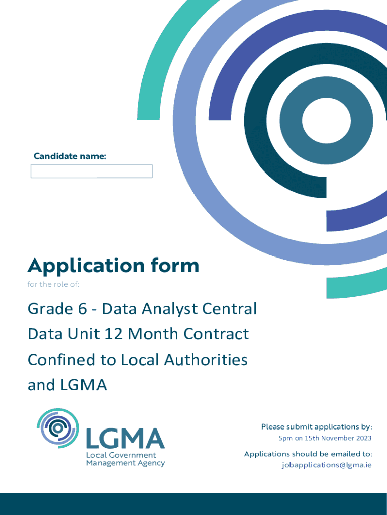 Candidate name:Application form for the role of:Grade 6 Data Analyst Central Data Unit 12 Month Contract Confined to Local Authorities and LGMA Please submit applications by: 5pm on 15th November
