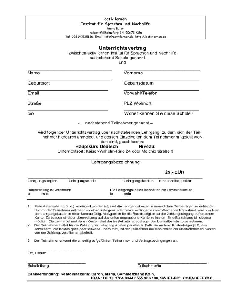 Tel: 0221/9525186, Email: info@activlernen.de, http://activlernen.deUnterrichtsvertrag