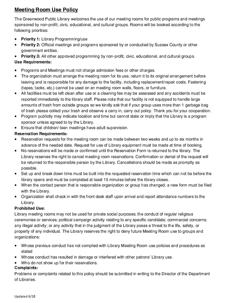 Meeting Room Use Policy The Greenwood Public Library welcomes the use of our meeting rooms for public programs and meetings sponsored by nonprofit, civic, educational, and cultural groups. Rooms will