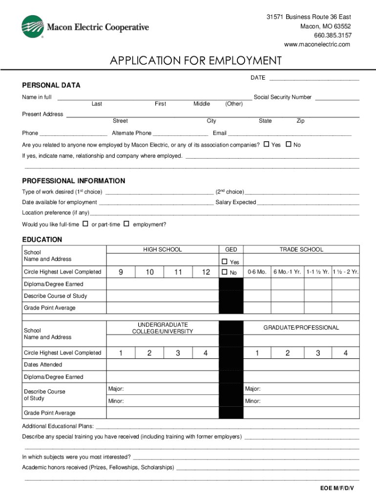 31571 Business Route 36 East Macon, MO 63552 660.385.3157 www.maconelectric.comAPPLICATION FOR EMPLOYMENT DATE ___PERSONAL DATA Name in fullSocial Security Number LastFirstMiddle(Other)Present Address