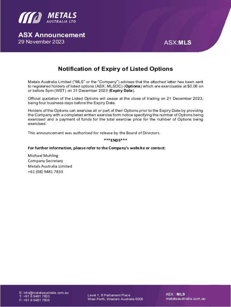 29 November 2023ASX:Notification of Expiry of Listed Options