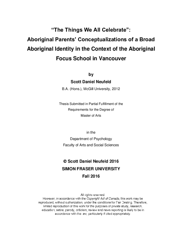 The Things We All Celebrate: Aboriginal Parents Conceptualizations of a Broad Aboriginal Identity in the Context of the Aboriginal Focus School in Vancouver by Scott Daniel Neufeld B.A. (Hons.), McGill
