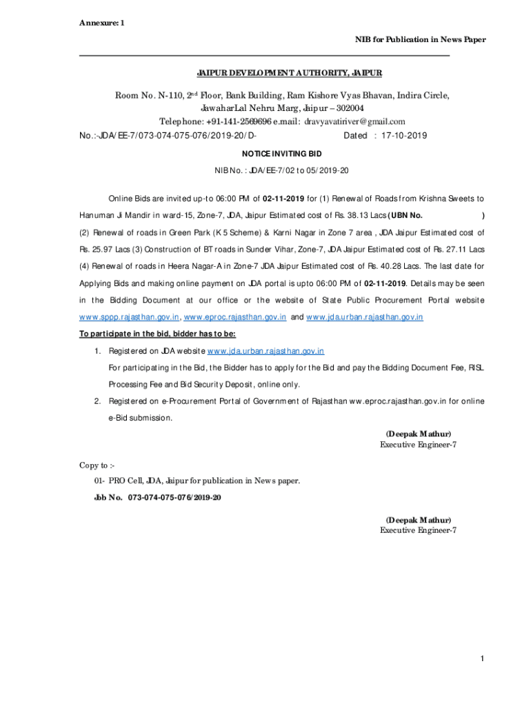 NIB for Publication in News PaperJAIPUR DEVELOPMENT AUTHORITY, JAIPURRoom No. N110, 2nd Floor, Bank Building, Ram Kishore Was Haven, Indira Circle,
