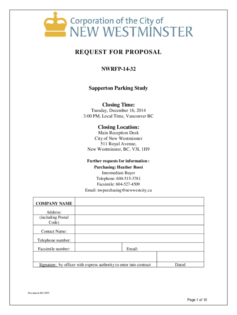 REQUEST FOR PROPOSAL NWRFP1432Sapperton Parking Study Closing Time: Tuesday, December 16, 2014 3:00 PM, Local Time, Vancouver BCC losing Location: Main Reception Desk City of New Westminster 511 Royal