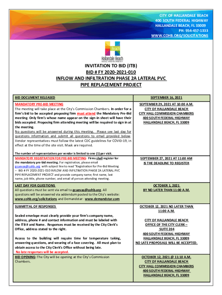 CITY OF HALLANDALE BEACH 400 SOUTH FEDERAL HIGHWAY HALLANDALE BEACH, FL 33009 PH: 9544571333 WWW.COHB.ORG/SOLICITATIONSINVITATION TO BID (ITB) BID # FY 20202021010 INFLOW AND INFILTRATION PHASE 2A