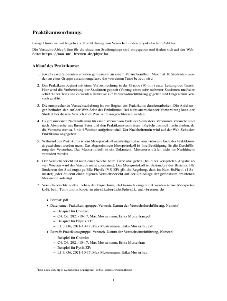 Praktikumsordnung: Einige Hinweise und Regeln zur Durchfhrung von Versuchen in den physikalischen Praktika: Die VersuchsAblaufplne fr die einzelnen Studiengnge sind vorgegeben und finden sich auf