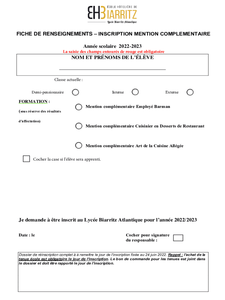 FICHE DE REASSIGNMENTS INSCRIPTION MENTION COMPLEMENTAIREAnne Claire 20222023La Maisie DES champs entours de rouge est obligatoireNOM ET PROMS DE LOVE