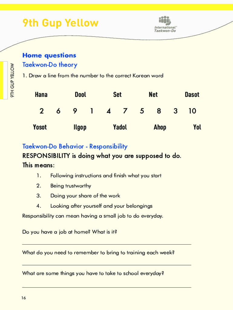 9th Gup Yellow9TH GUP YELLOWHome questions TaekwonDo theory 1. Draw a line from the number to the correct Korean wordHanaDool26Yosot9Set 1Ilgop4Net 75Yadol8Dasot 310AhopTaekwonDo Behavior Responsibility