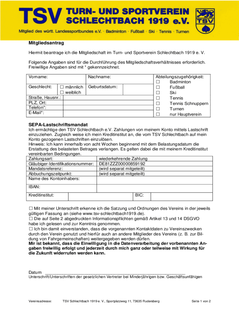 Hermit barrage ICH die Mitgliedschaft I'm Turn UND Sportverein Schlechtbach 1919 e. V.