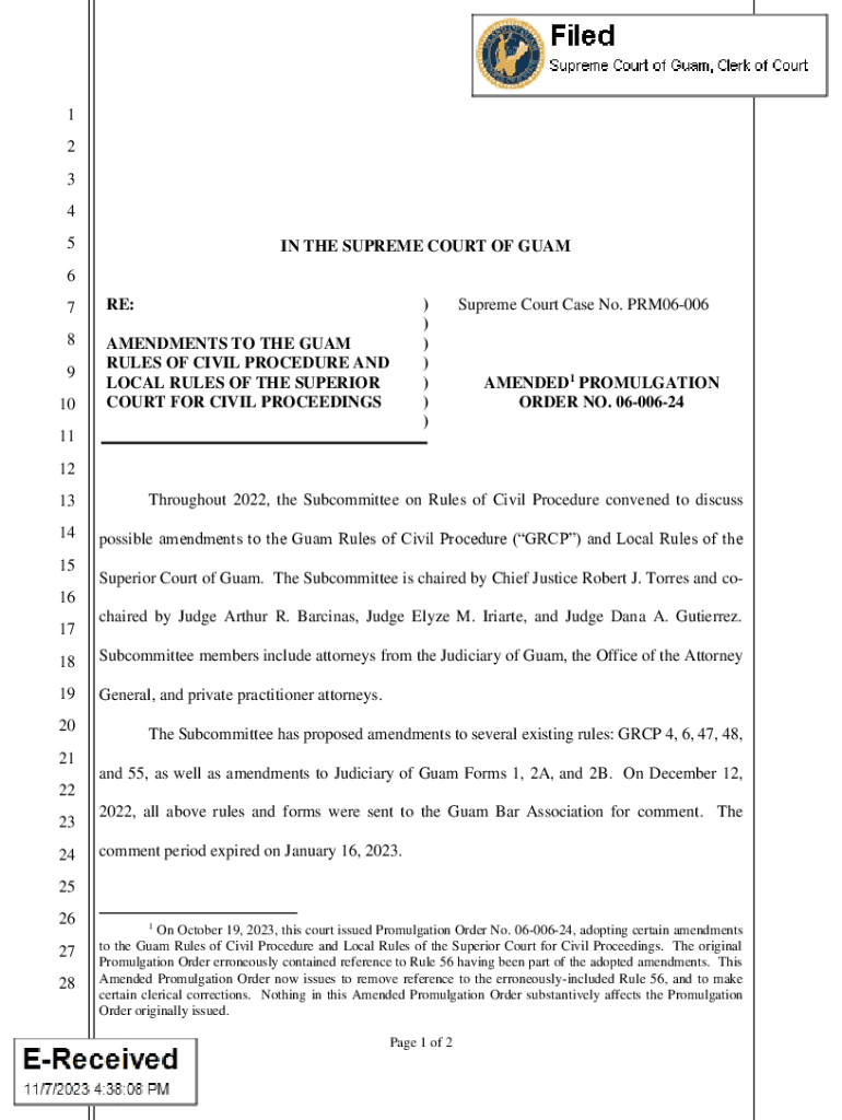 1 2 3 4 5IN THE SUPREME COURT OF GUAM6 7RE:8AMENDMENTS TO THE GUAM RULES OF CIVIL PROCEDURE AND LOCAL RULES OF THE SUPERIOR COURT FOR CIVIL PROCEEDINGS9 10) ) ) ) ) ) )11Supreme Court Case No. PRM06006AMENDED1