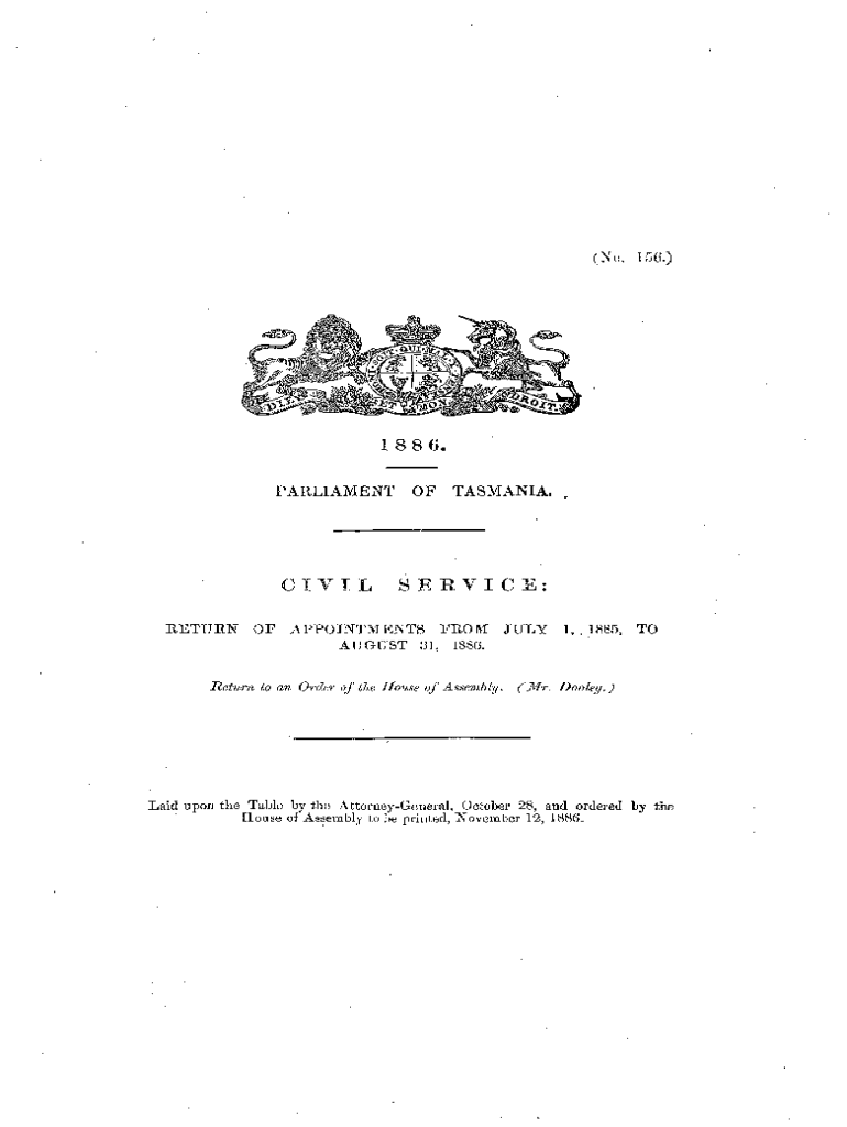 (o. 156.)18 8 6. PARLIAMENTCIVIL RETURNOFTASMANIA.SERVICE:OF APPOINTMENTS FROM AUGUST 31, 1886. Return to an Order of the House of Assembly.JULY1, 1885,TO(Mr. Dooley.) Laid upon the Table by the AttorneyGeneral,