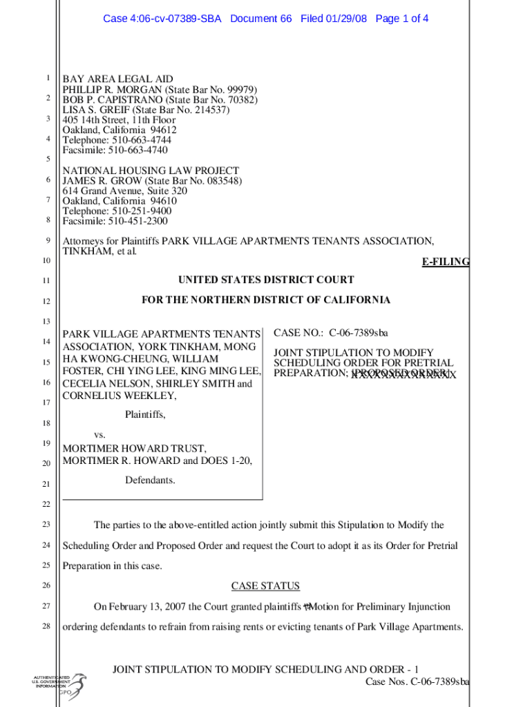 Case 4:06cv07389SBA Document 66 Filed 01/29/08-Page 1 of 41 2 3 4BAY AREA LEGAL AID PHILLIP R. MORGAN (State Bar No. 99979) BOB P. CAPISTRANO (State Bar No. 70382) LISA S. GRE IF (State Bar No. 214537)