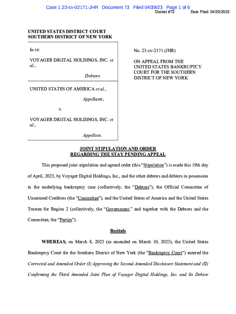 Case 1:23cv02171JHR Document 72 71 Filed 04/20/23 04/19/23-Page 1 of 6 Docket #72Date Filed: 04/20/2023UNITED STATES DISTRICT COURT SOUTHERN DISTRICT OF NEW YORK In re:No. 23cv2171 (JR)VOYAGER DIGITAL