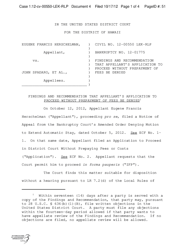 Case 1:12cv00550LEKRLP Document 4Filed 10/17/12 Page 1 of 4PageID #: 51IN THE UNITED STATES DISTRICT COURT FOR THE DISTRICT OF HAWAII EUGENE FRANCIS HERSCHELMAN,) ) Appellant, ) ) vs. ) ) ) JOHN SPADARO,