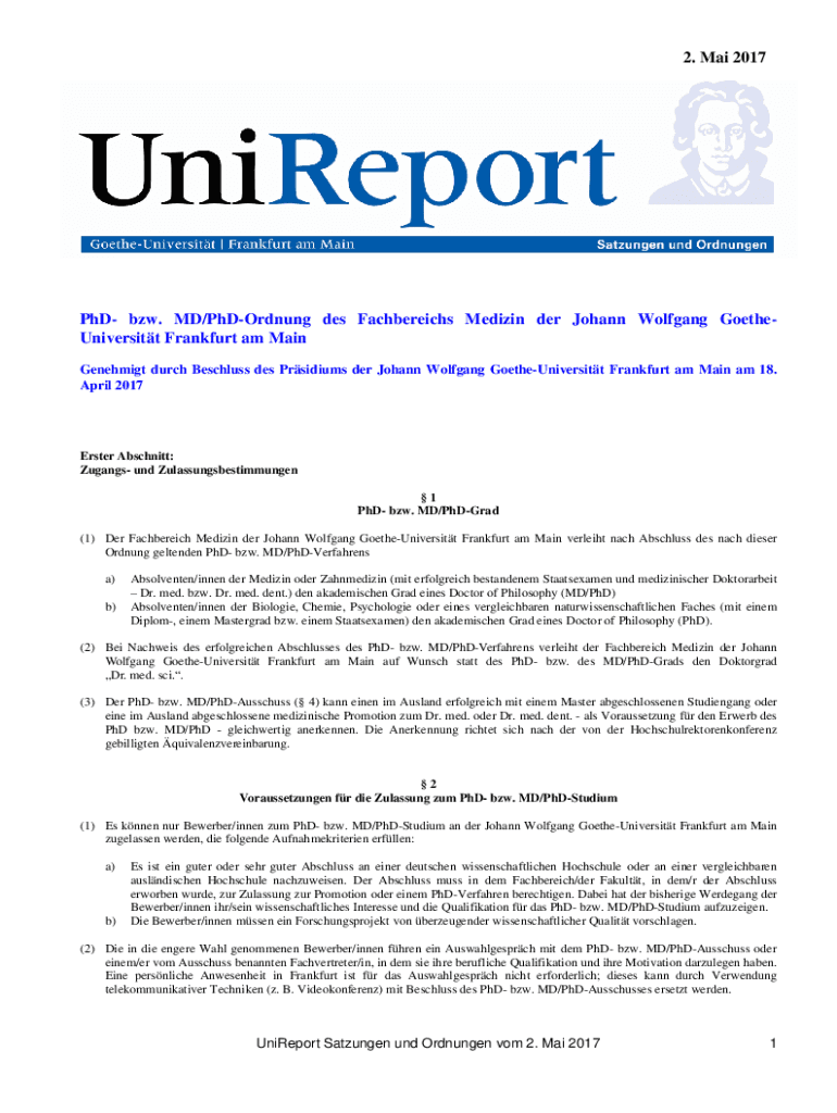 2. Mai 2017PhD BMW. MD/PhDOrdnung DES Fachbereichs Median her Johann Wolfgang GoetheUniversitt Frankfurt am Main