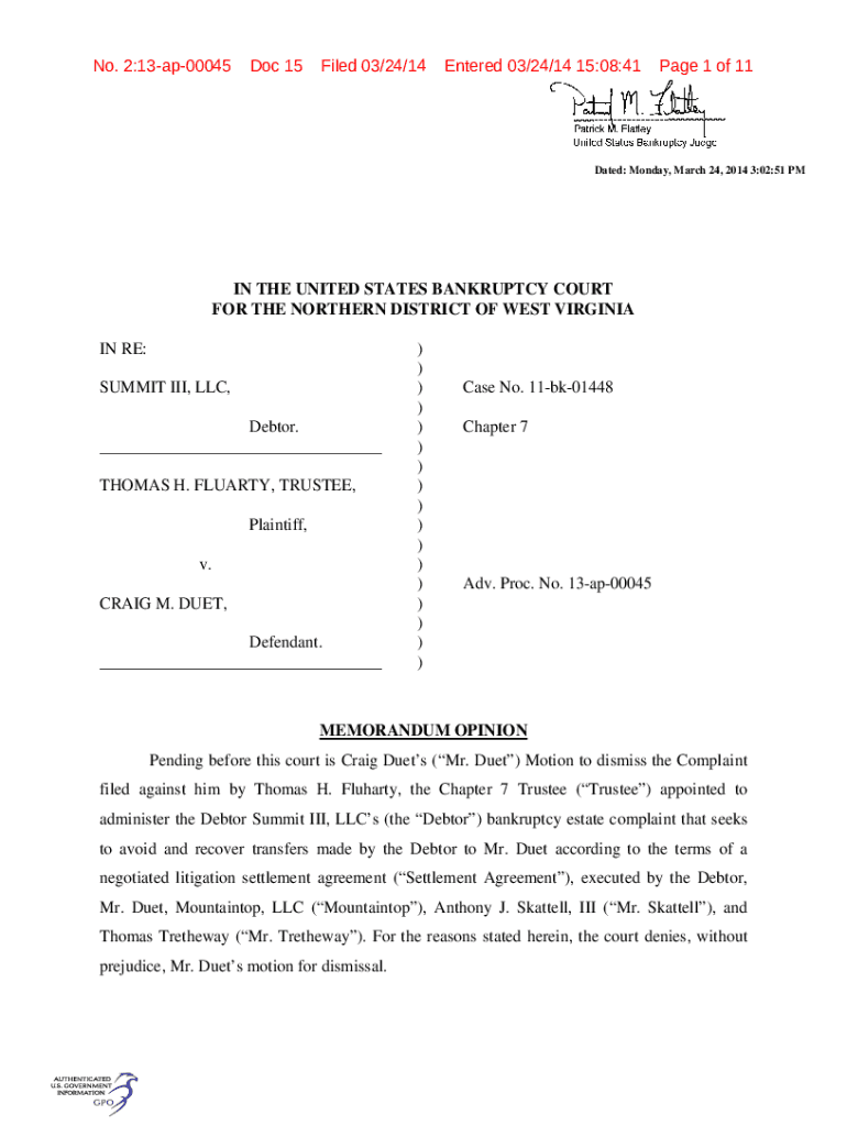 No. 2:13ap00045Doc 15Filed 03/24/14Entered 03/24/14 15:08:41Page 1 of 11Dated: Monday, March 24, 2014 3:02:51 PAIN THE UNITED STATES BANKRUPTCY COURT FOR THE NORTHERN DISTRICT OF WEST VIRGINIA IN
