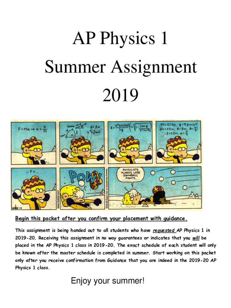 AP Physics 1 Summer Assignment 2019Begin this packet after you confirm your placement with guidance. This assignment is being handed out to all students who have requested AP Physics 1 in 201920.