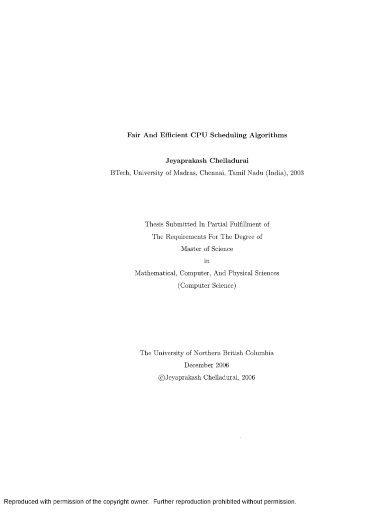 Fair A ND Efficient C P U Scheduling A algorithm sJeyaprakash C helladurai Tech, University of Madras, Chennai, Tamil Nadu (India), 2003Thesis Submitted In Partial Fulfillment of The Requirements