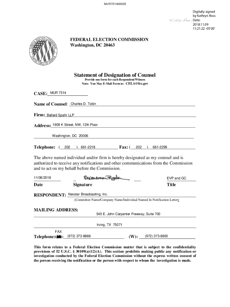 MUR751400026Digitally signed by Kathryn Ross Date: 2018.11.09 11:21:22 05\'00\'FEDERAL ELECTION COMMISSION Washington, DC 20463Statement of Designation of Counsel Provide one form for each Respondent/Witness