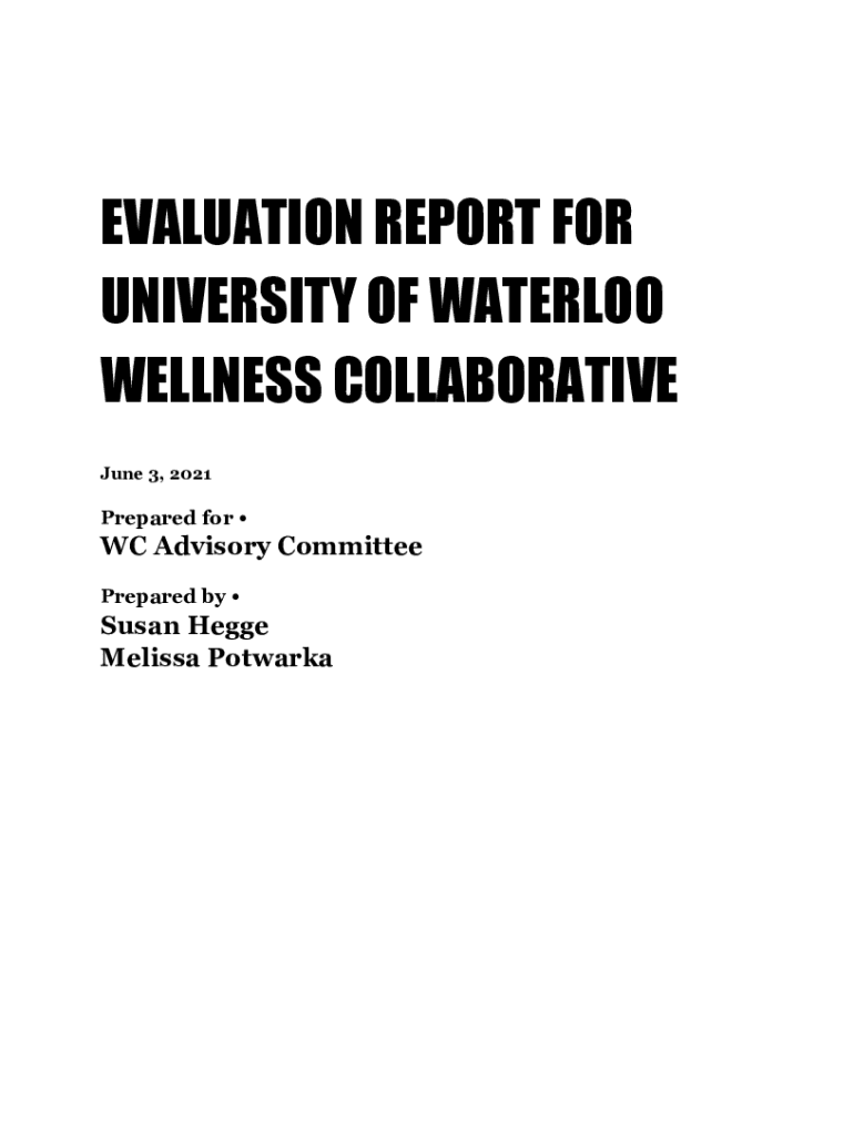 EVALUATION REPORT FOR UNIVERSITY OF WATERLOO WELLNESS COLLABORATIVE June 3, 2021Prepared for WC Advisory Committee Prepared by Susan Hedge Melissa PotwarkaA Note on the Evaluation It has been an honor