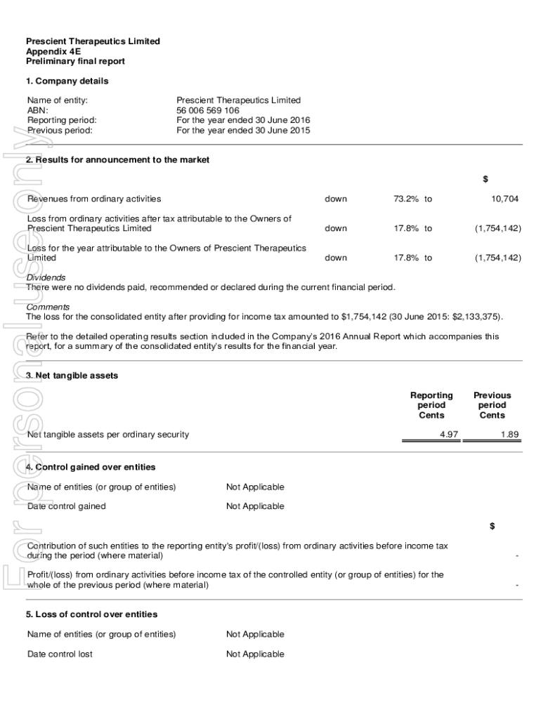 Prescient Therapeutics Limited Appendix 4E Preliminary final report 1. Company details personal use online of entity: ABN: Reporting period: Previous period:Prescient Therapeutics Limited 56 006 569