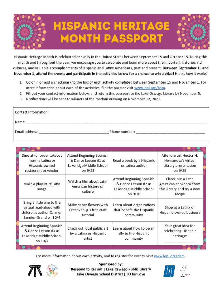 Since Hispanic Heritage Month is not a filing or official application process, there are no forms to fill out. Instead, individuals and organizations can participate by organizing events, educational programs, and activities that celebrate Hispanic heritage.