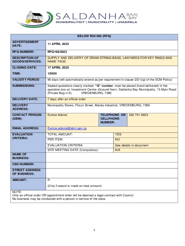 DATE:11 APRIL 2023RFQ NUMBER:RFQ168/2023DESCRIPTION OF