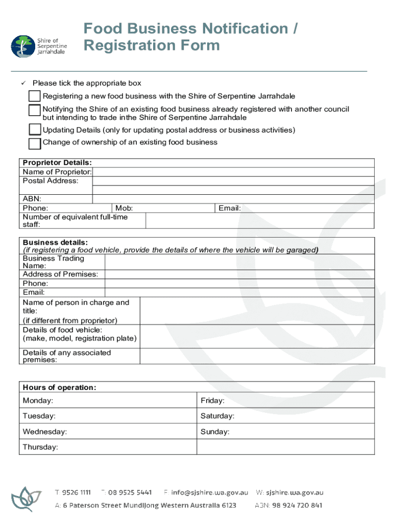Food Business Notification / Registration Form Please tick the appropriate box Registering a new food business with the Shire of Serpentine Jarrahdale Notifying the Shire of an existing food business