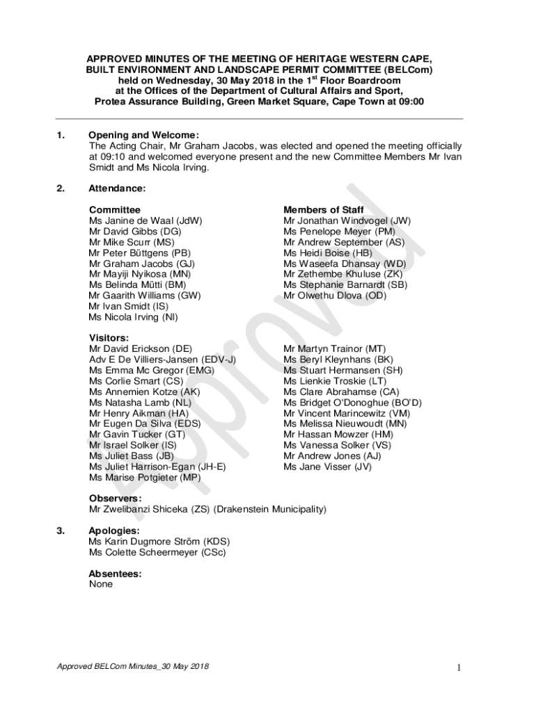 APPROVED MINUTES OF THE MEETING OF HERITAGE WESTERN CAPE, BUILT ENVIRONMENT AND LANDSCAPE PERMIT COMMITTEE (Become) held on Wednesday, 30 May 2018 in the 1st Floor Boardroom at the Offices of the