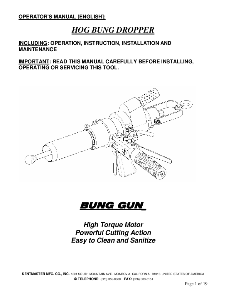 OPERATORS MANUAL [ENGLISH]:HOG BUNG DROPPER INCLUDING: OPERATION, INSTRUCTION, INSTALLATION AND MAINTENANCE IMPORTANT: READ THIS MANUAL CAREFULLY BEFORE INSTALLING, OPERATING OR SERVICING THIS TOOL.BUNG