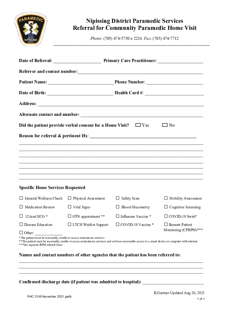 Ni pissing District Paramedic Services Referral for Community Paramedic Home Visit Phone: (705) 4745750 × 2226 Fax: (705) 4747712 ___Date of Referral: ___ Primary Care Practitioner: ___ Referrer