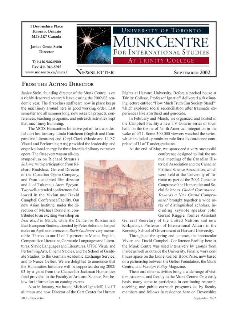 1 Devonshire Place Toronto, Ontario M5S 3K7 Canada Janice Gross Stein Director Tel: 416.9468900 Fax: 416.9468915 www.utoronto.ca/mcis/NEWSLETTERSEPTEMBER 2002FROM THE ACTING DIRECTOR Janice Stein,