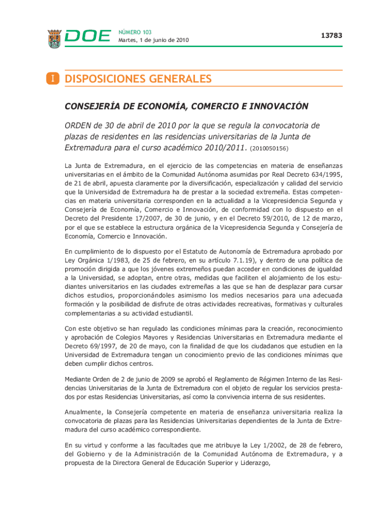 Mates, 1 de junior de 2010I13783DISPOSICIONES GENERALS