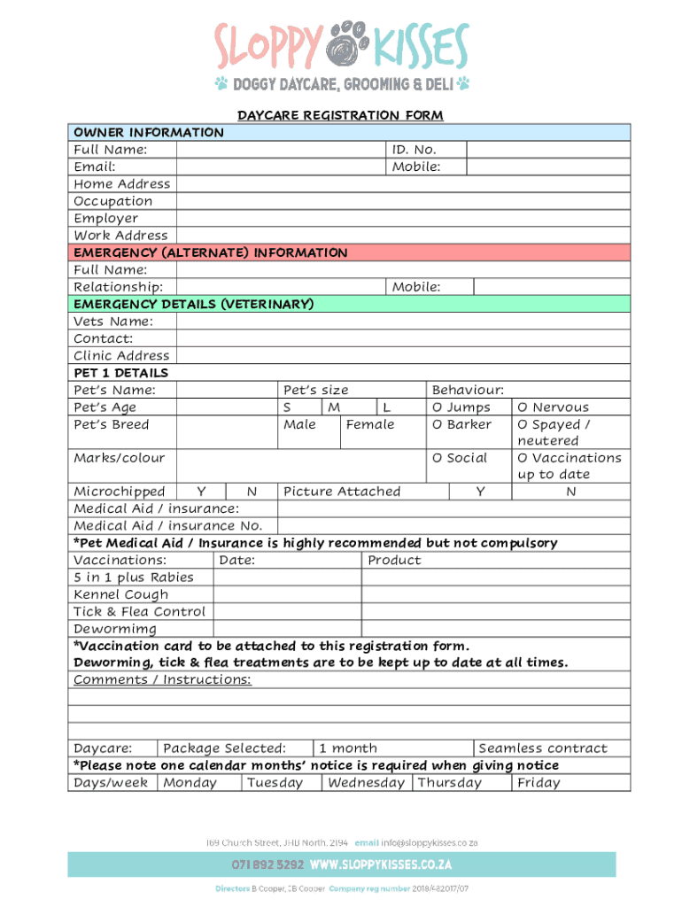 DAYCARE REGISTRATION FORM OWNER INFORMATION Full Name: ID. No. Email: Mobile: Home Address Occupation Employer Work Address EMERGENCY (ALTERNATE) INFORMATION Full Name: Relationship: Mobile: EMERGENCY