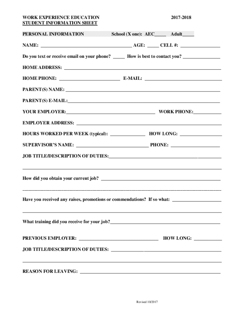 WORK EXPERIENCE EDUCATION STUDENT INFORMATION SHEET PERSONAL INFORMATION20172018School (X one): AEC___Adult___NAME: ___ AGE: ___ CELL #: ___ Do you text or receive email on your phone? ___ How is
