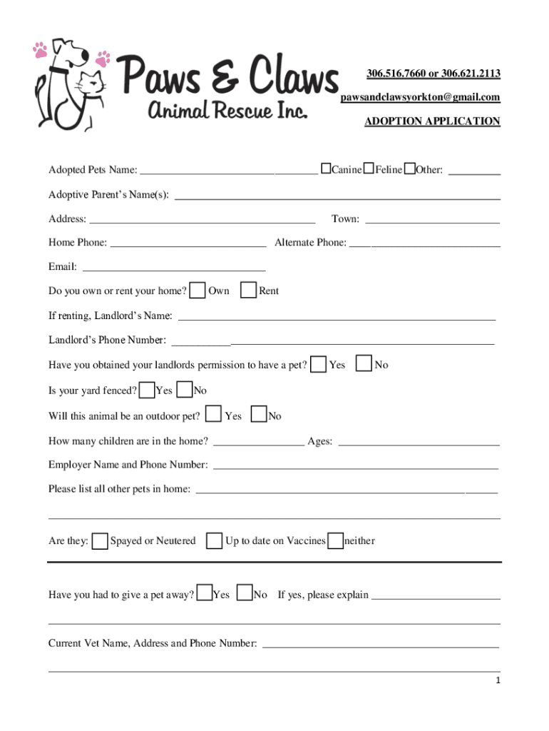306.516.7660 or 306.621.2113 pawsandclawsyorkton@gmail.com ADOPTION APPLICATIONAdopted Pets Name: ___ Canine Feline Other: Adoptive Parents Name(s): Address: ___Town: ___Home Phone: ___ Alternate
