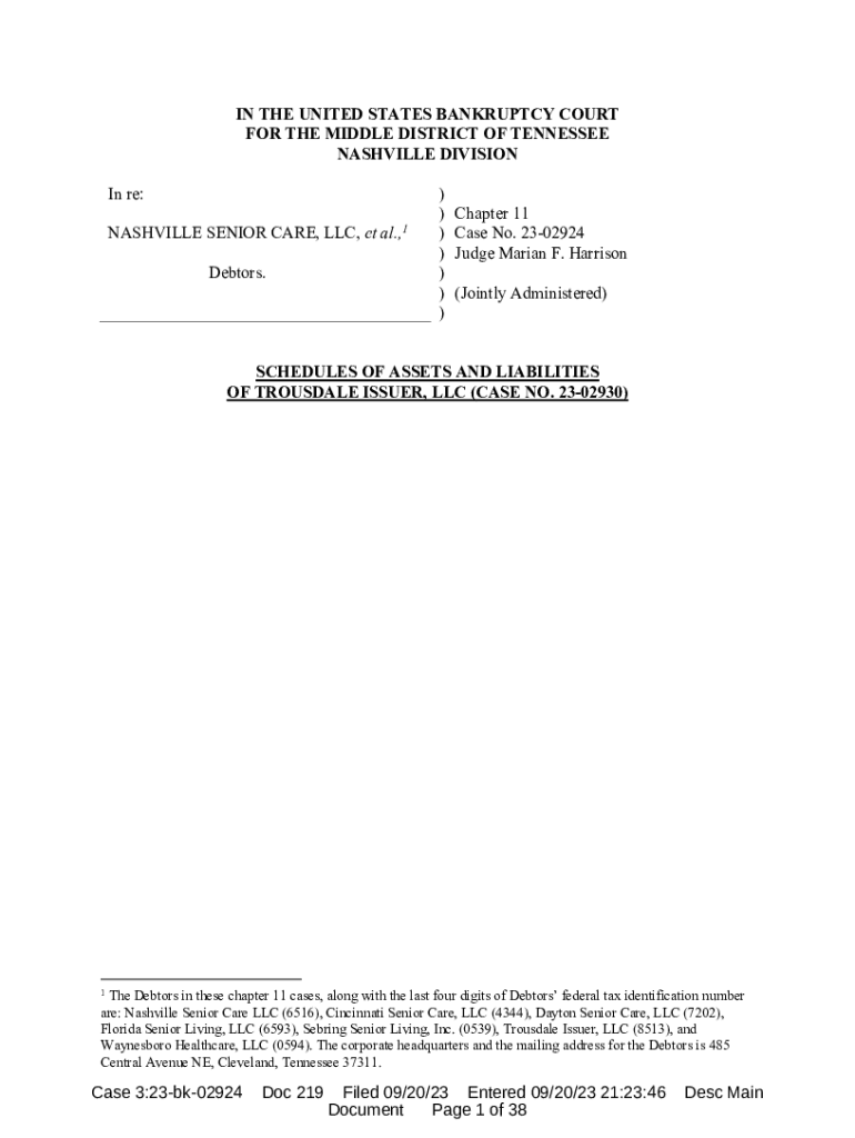 IN THE UNITED STATES BANKRUPTCY COURT FOR THE MIDDLE DISTRICT OF TENNESSEE NASHVILLE DIVISION In re: NASHVILLE SENIOR CARE, LLC, et al., 1 Debtors.) ) ) ) ) ) )Chapter 11 Case No. 2302924 Judge Marian