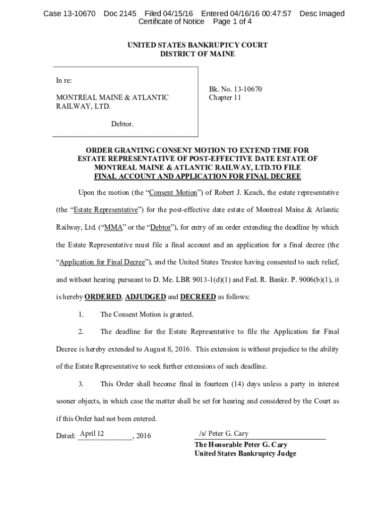Case 1310670Doc 2145Filed 04/15/16 Entered 04/16/16 00:47:57 Certificate of Notice Page 1 of 4Desc ImagedUNITED STATES BANKRUPTCY COURT DISTRICT OF Maintain re: MONTREAL MAINE & ATLANTIC RAILWAY,