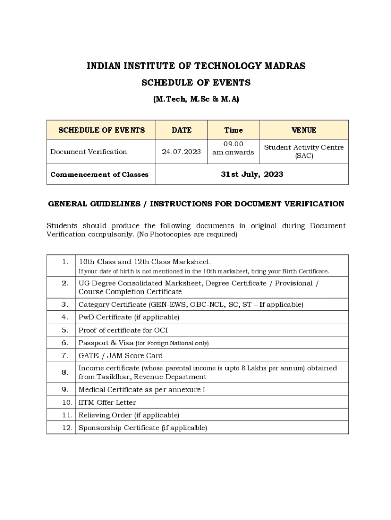INDIAN INSTITUTE OF TECHNOLOGY MADRAS SCHEDULE OF EVENTS (M. Tech, M.Sc. & M. A)SCHEDULE OF EVENTS Document VerificationDATETimeVENUE24.07.202309.00 am onwardsStudent Activity Center (SAC)Commencement