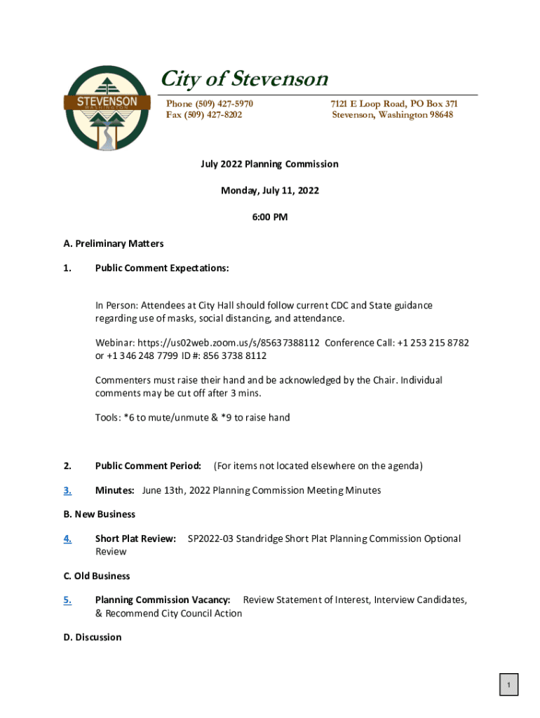 City of Stevenson Phone (509) 4275970 Fax (509) 42782027121 E Loop Road, PO Box 371 Stevenson, Washington 98648July 2022 Planning Commission Monday, July 11, 2022 6:00 PM A. Preliminary Matters 1.