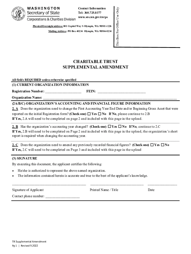 Physical/Overnight address: 801 Capitol Way S Olympia, WA 985011226 Mailing Address: PO Box 40234 Olympia, WA 985040234This Box For Office Use Non-contact Information Tel: 360.725.0377 www.sos.wa.gov/corpsCHARITABLE