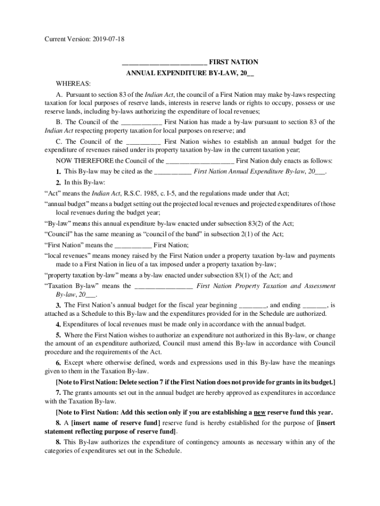 Current Version: 20190718 ___ FIRST NATION ANNUAL EXPENDITURE BYLAW, 20__ WHEREAS: A. Pursuant to section 83 of the Indian Act, the council of a First Nation may make bylaws respecting taxation for