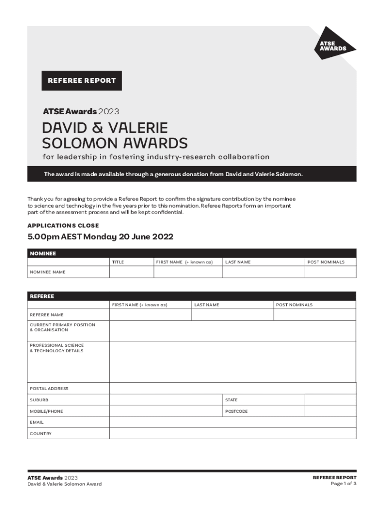 REFEREE REPORTAGE Awards 2023DAVID & VALERIE SOLOMON AWARDS for leadership in fostering industry research collaboration The award is made available through a generous donation from David and Valerie