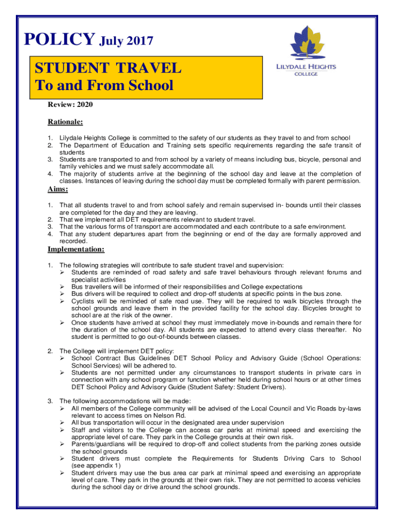 POLICY July 2017 STUDENT TRAVEL To and From School Review: 2020 Rationale: 1. Lilydale Heights College is committed to the safety of our students as they travel to and from school 2. The Department