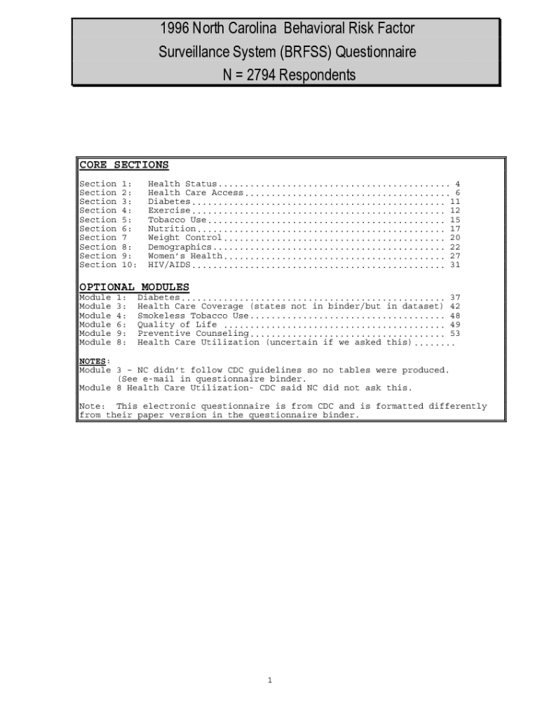 1996 North Carolina Behavioral Risk Factor Surveillance System (BRASS) Questionnaire N 2794 RespondentsCORE SECTIONS Section Section Section Section Section Section1: 2: 3: 4: 5: 6: 7 8: 9: 10:Health