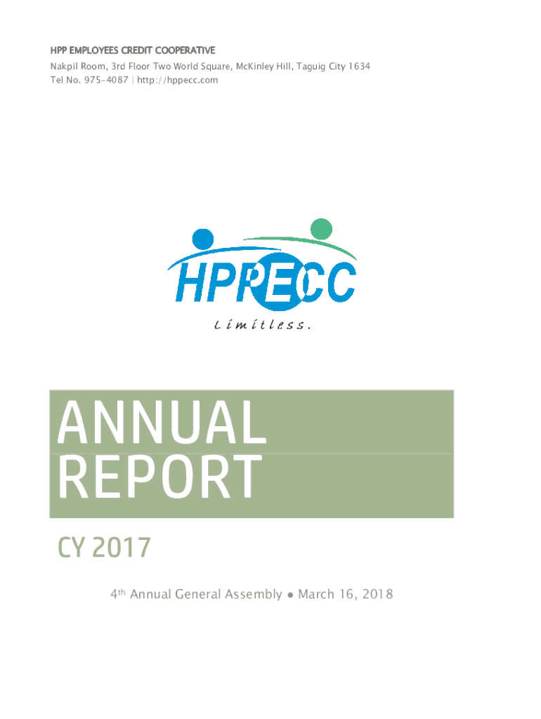 HPP EMPLOYEES CREDIT COOPERATIVE Nakpil Room, 3rd Floor Two World Square, McKinley Hill, Taguig City 1634 Tel No. 9754087 | http://hppecc.comANNUAL REPORT CY 2017 4th Annual General Assembly March