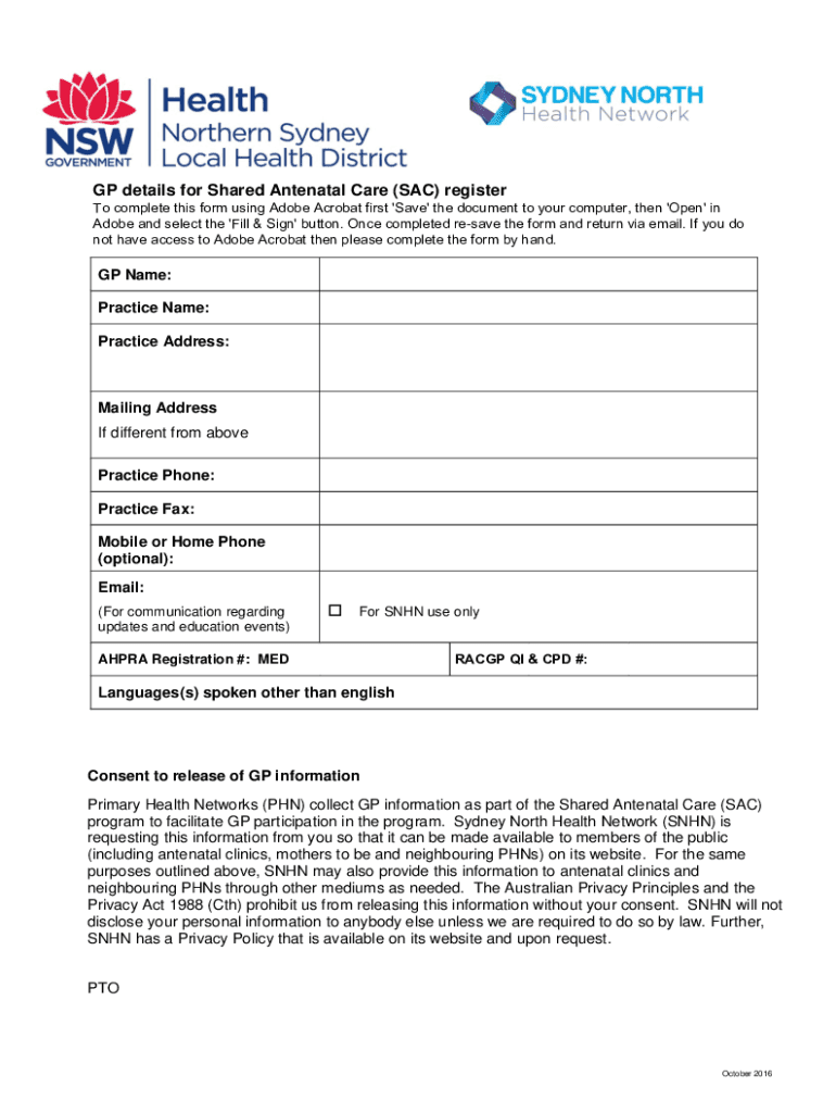 GP details for Shared Antenatal Care (SAC) register To complete this form using Adobe Acrobat first \'Save\' the document to your computer, then \'Open\' in Adobe and select the \'Fill & Sign\' button.